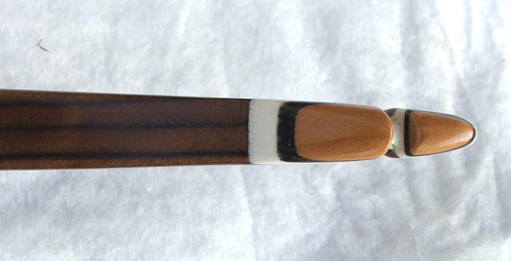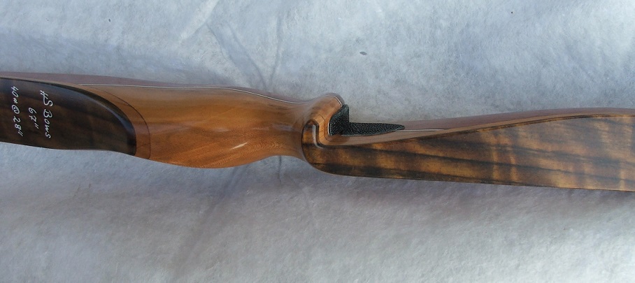 Wurfarme aus zwei mal 3,4 mm Kirschlaminat mit einer Mittellage aus Stabil Core, dazu je 0,6 mm Amazakoue Riegelfurnier und je 1 mm klares Gordonglas. Ausgangs Gesamtstack 10,4 mm mit einem Gesamttaper von 0,005. Der Griff ist aus Bubinga und Kirsche mit Ziereinlage. Griffoverlay aus Ahorn - Stabil Core - Kirsche, und die Tips aus weißem Mircarta - Stabil Core und Kirsche.