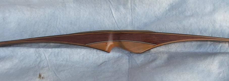 Wurfarme aus zwei mal 3,4 mm Kirschlaminat mit einer Mittellage aus Stabil Core, dazu je 0,6 mm Amazakoue Riegelfurnier und je 1 mm klares Gordonglas. Ausgangs Gesamtstack 10,4 mm mit einem Gesamttaper von 0,005. Der Griff ist aus Bubinga und Kirsche mit Ziereinlage. Griffoverlay aus Ahorn - Stabil Core - Kirsche, und die Tips aus weißem Mircarta - Stabil Core und Kirsche.
