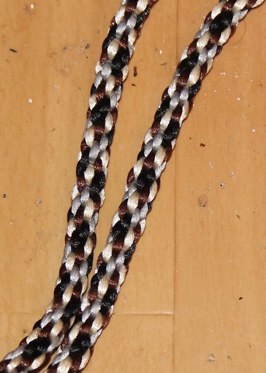 Nun zu der nächsten erforderlichen Kordel . In Abstimmung mit der Fellfarbe und der Korpusfarbe habe ich mich für 4 Farben entschieden : Schwarz, Grau, dunkelbraun, Beige.Es sind 8 Stränge dieser Farben nötig , jeweils 5 m lang und ergibt eine Kordel von ca. 1,25m , geflochten nach Kumihimo Art Yatsu Kongo. Die 2 Trodeln werden aus Perlseide hergestellt.