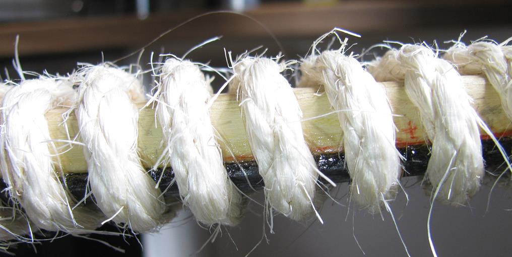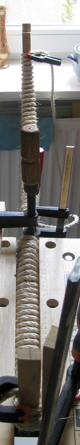 2. Holrahmen einspannen, erwärmte Flächen großzügig mit Leim bepinseln und aufeinanderlegen. Am Griff mit Schraubzwinge festziehen. Tendschek-Seil mit Webleinstek (Segelwissen, dass man immer wieder brauchen kann ;) ) festknoten und Wickeln.