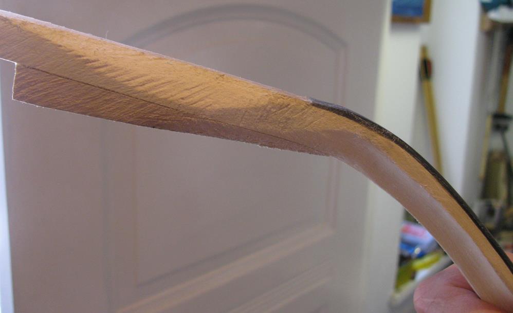 hier sieht man den bereits erwähnten seitlich austretenden Riss im Horn, der dann aber seitlich vom Sehnenbelag gesichert werden wird. Daneben, im Übergang zum Kasan, scheint die Klebefuge nicht ganz optimal. Könnte aber auch wieder gut aussehen, wenn ich noch 1 oder 2mm abtrage.