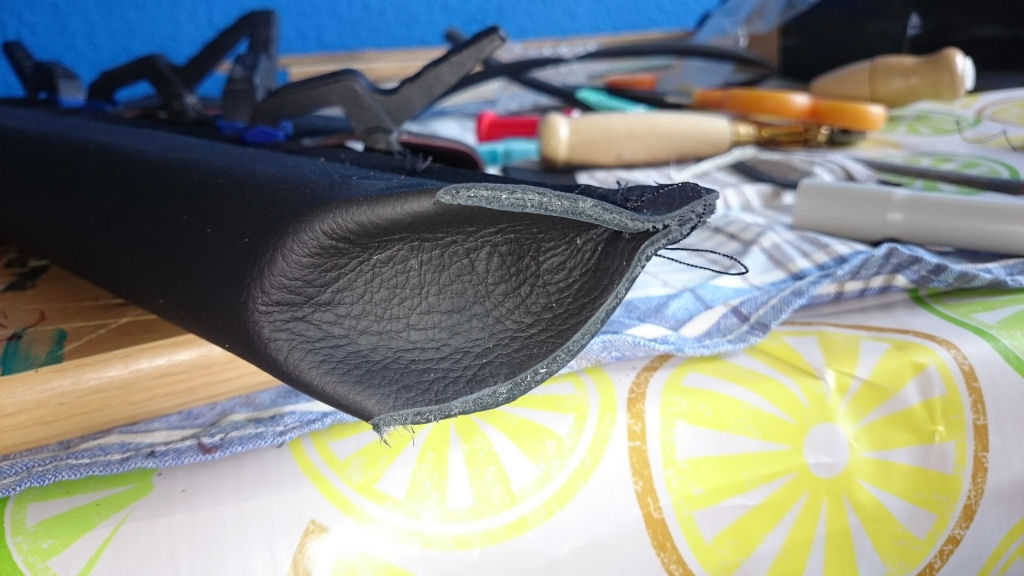 Nein geklebt ist da nix...hab es nur mit ein paar Stichen zusammengeheftet. Kleber hab ich bis jetzt vermieden, weil ich da immer so ne Sauerei mit mach. Bei Epoxy kann man ja wegschleifen, aber bei Leder...naja.