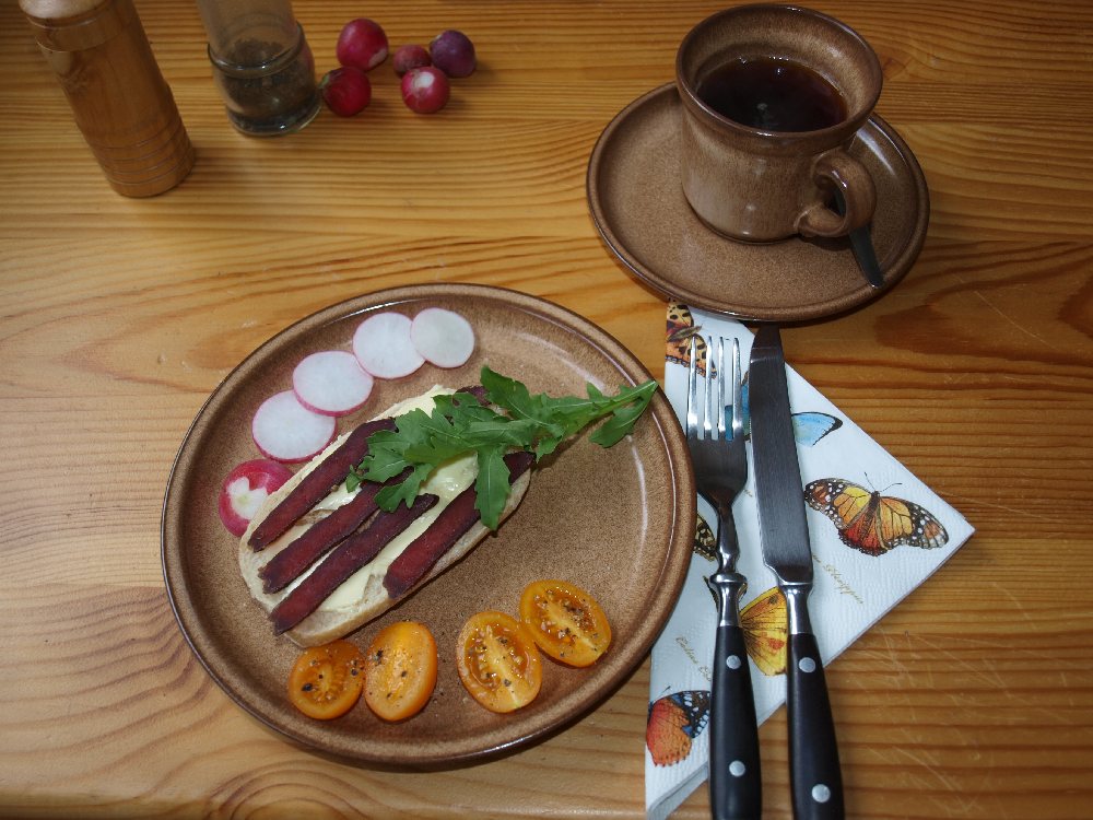 Bilton mit Rucola auf gebuttertem Brötchen mit frischen Radieschen und Tomaten aus dem eigenen Garten, dazu eine Tasse Ostfriesentee.