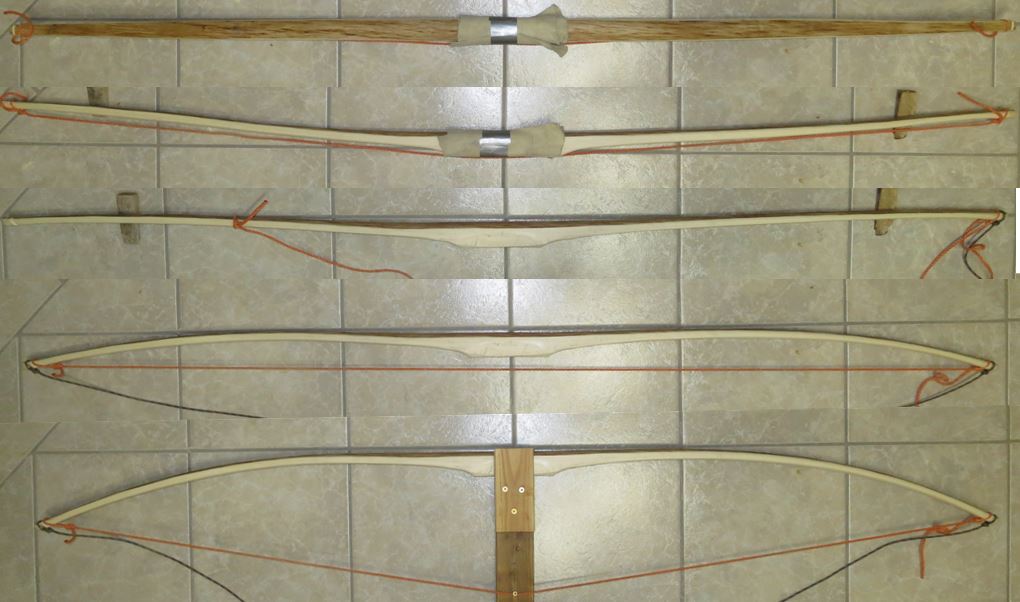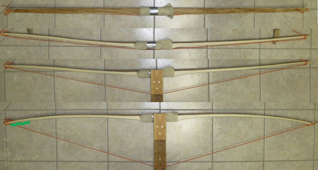 Eigentlich darfst Du jetzt schon mal mit dieser Hilfssehne richtig ziehen. Die Wurfarme nur ein bisschen krumm werden lassen. Dabei gut beobachten ob sich beide Wurfarme gleichmässig biegen, also eine schön runde Kurve bildet und beidseitig gleich viel.