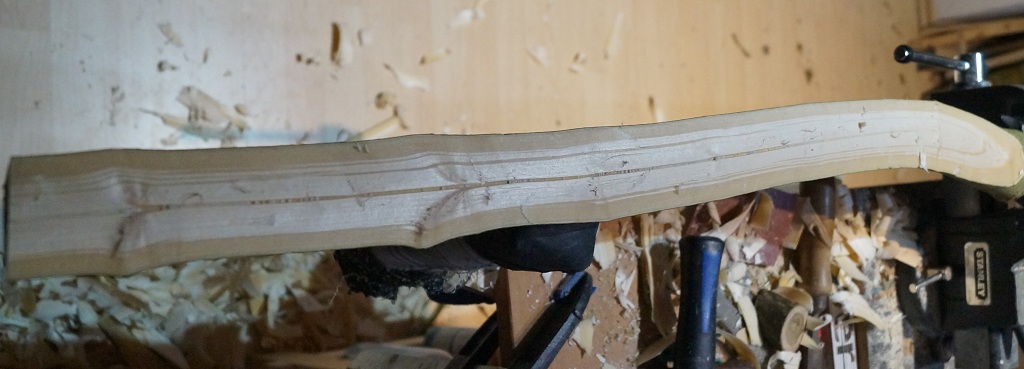 Bei einem der beiden möchte ich warscheinlich einen Stabbogen mit mitbiegendem Griffteil, dennoch habe ich den Stave mit Griff zum trocknen gelegt einfach das ich falls ich mich doch anders entscheiden sollte keinen Griff aufkleben muss.