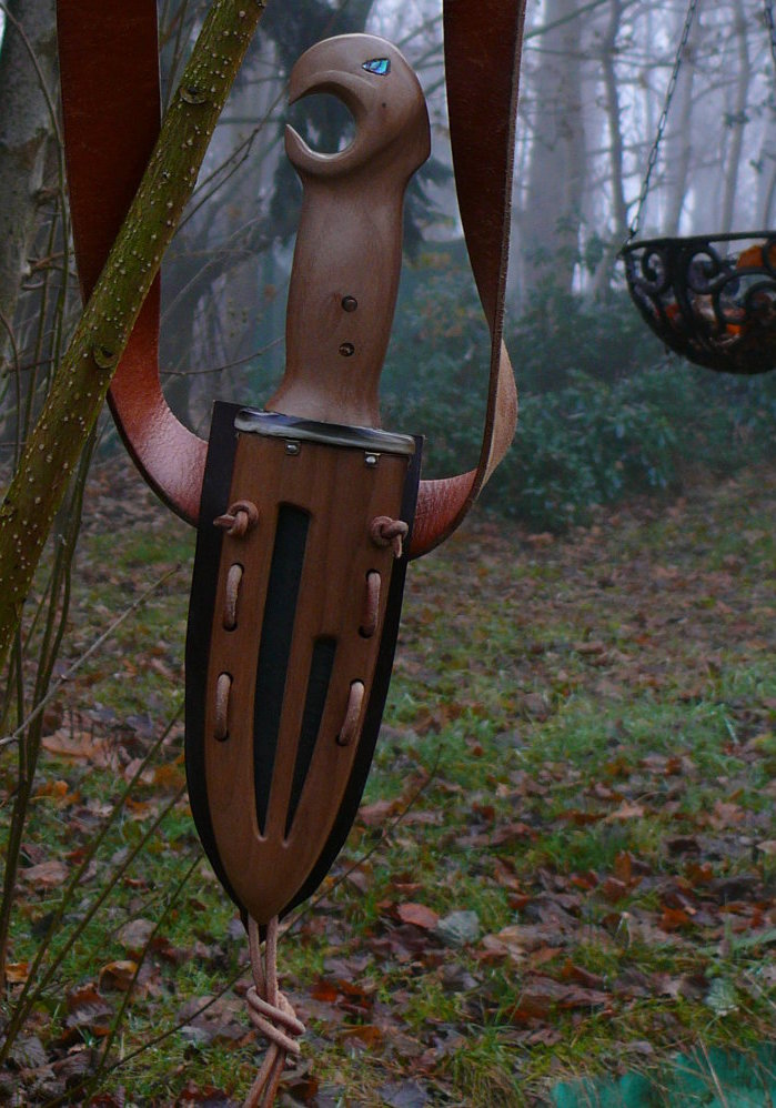 Griff und Scheide sind mal wieder aus einem Stück, Nußbaum diesmal; Erbschen, danke noch mal dafür und ich hoffe, Du kannst mit dem Kricketschläger, der draus geworden ist, leben.