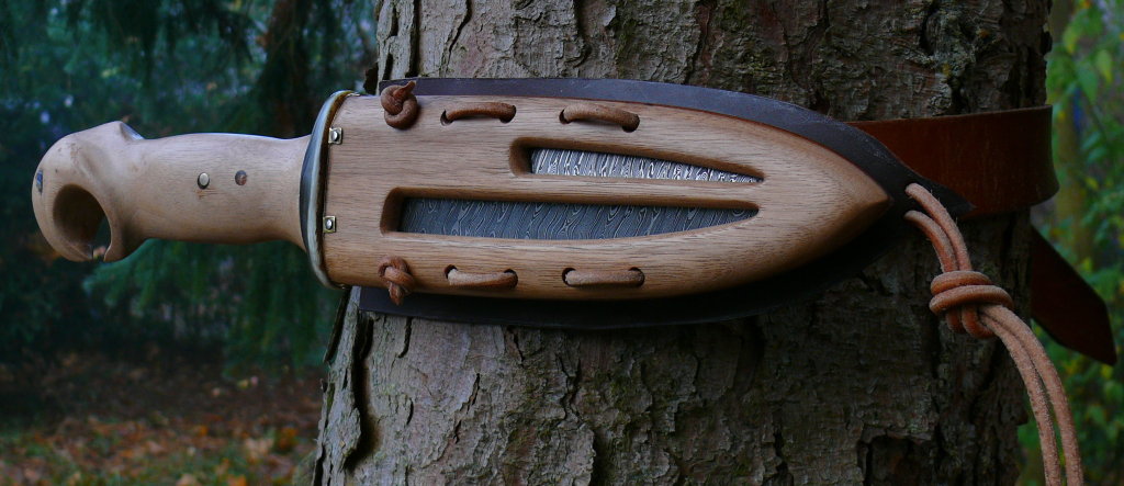 Da muß ich etwas ausholen.Denn ein Bogenschütze, dem bereits aufgefallen ist, daß die Scheidenrückseite konkav geformt ist, kann sich vielleicht schon noch eine weitere Möglichkeit, das Messer zu tragen, vorstellen.
