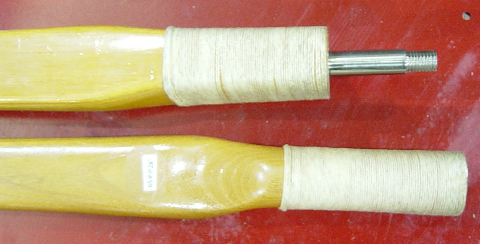 aufgebracht wäre. Bei dem Verbindungsstück in der Mitte würde ich den Quersteg (falls er nicht von Nöten ist) wegfeilen und mit gleicher Lederwicklung versehen, wie die Griffe.