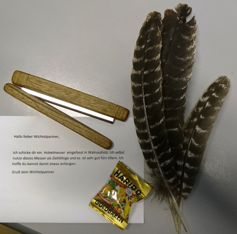 Ich habe mein Geschenk gestern Abend ausgepackt. Ich habe eine tolle, selbstgemachte „Ziehklinge“, drei schöne Federn und etwas Süsses von meinem Wichtel bekommen und mich riesig gefreut! Ich habe eine Vermutung, bin mir aber nicht sicher, so oder so vielen lieben Dank meinem Wichtel!