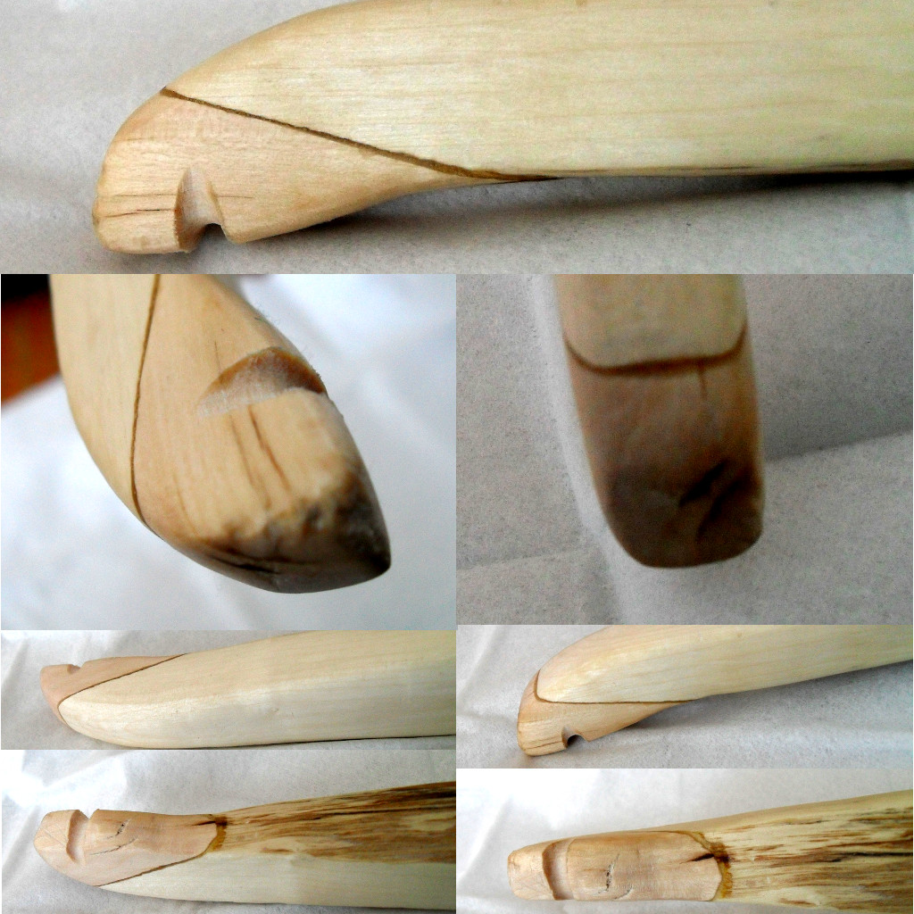 Hab nur mal alles grob gemacht, den Hartriegel hab ich gesägt (mit meiner super Klappsäge, die jetz wohl nimmer so super sein dürfte ...) und gespalten in kleine Klötzchen 2x2x4 cm. In der Mikrowelle heiss gemacht zum Blitztrocknen (3x1min 800 Watt, dazwischen rausgenommen und abgekühlt). Von den vier Klötzchen ist davon dieses hier an mehreren Stellen etwas eingerissen, und noch eins an einer Stelle, zwei blieben unversehrt. Dann möglichst plane Kontaktfläche mit der Raspel an Bogen und Hartriegelklötzchen geraspelt. Mit großzügig Uhu Endfest 300 beschmiert und 24 h gewartet. Leicht angedrückt (vielleicht könnte ich hier noch stärker andrücken um die Epoxyschicht dünner zu machen??). Zum Schluss mit Raspel, Ziehklinge und Schmirgelpapier oberflächlich gefinisht. Lektion: 1. Den Rücken Schützen - hier hatte ich noch Bast drauf das war optimal, leider ist der ist bei Nr.2. gestern weggekommen (werd ich in Zukunft en den Tips dranlassen), also werd ich wohl zumindest abkleben oder so. Ich hab am Übergang auch mit einem kleinen Messer rumgeschnitzt das ging noch ganz gut da mein Uhu Endfest 300 nach 24h RT noch etwas weich ist (komisch oder?). 2. Wenn man Hartriegel mit der Metallsäge bearbeiten will muss man sich die Nase zuklammern, das ist echt üüüübel... 3. vorschichtig mit einem scharfen Messer am Übergang abtragen ist fast noch besser als die Raspel find ich.