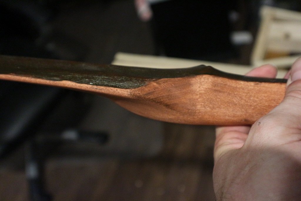 ich würde dir beim nächsten mal empfehlen den Bogen vorher mit Leinöl zu behandeln. Um die kapilarität des Holzes zu verringern.