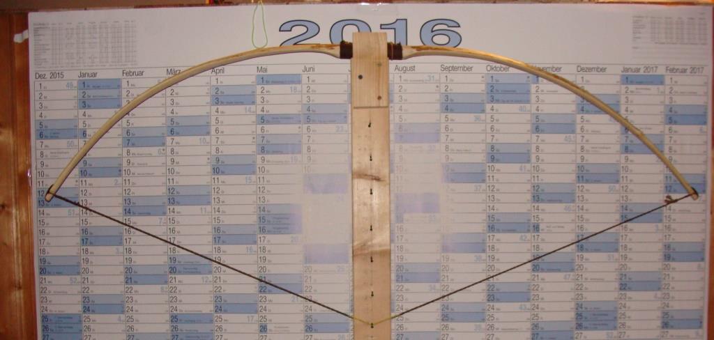 So ich hab jetzt noch ein wenig Zeit gefunden den Bogen fertigzustellen und ein paar Bilder zu machen. Ich habe überlegt rechts zwischen Nov/Dez noch etwas wegzunehmen, es aber dabei gelassen, da ich durch die versetzten Äste zu viel Unruhe reinbringen würde und ich das Gefühl hatte, dass jeder noch so kleine Span sich sofort auf den Tiller auswirkt.