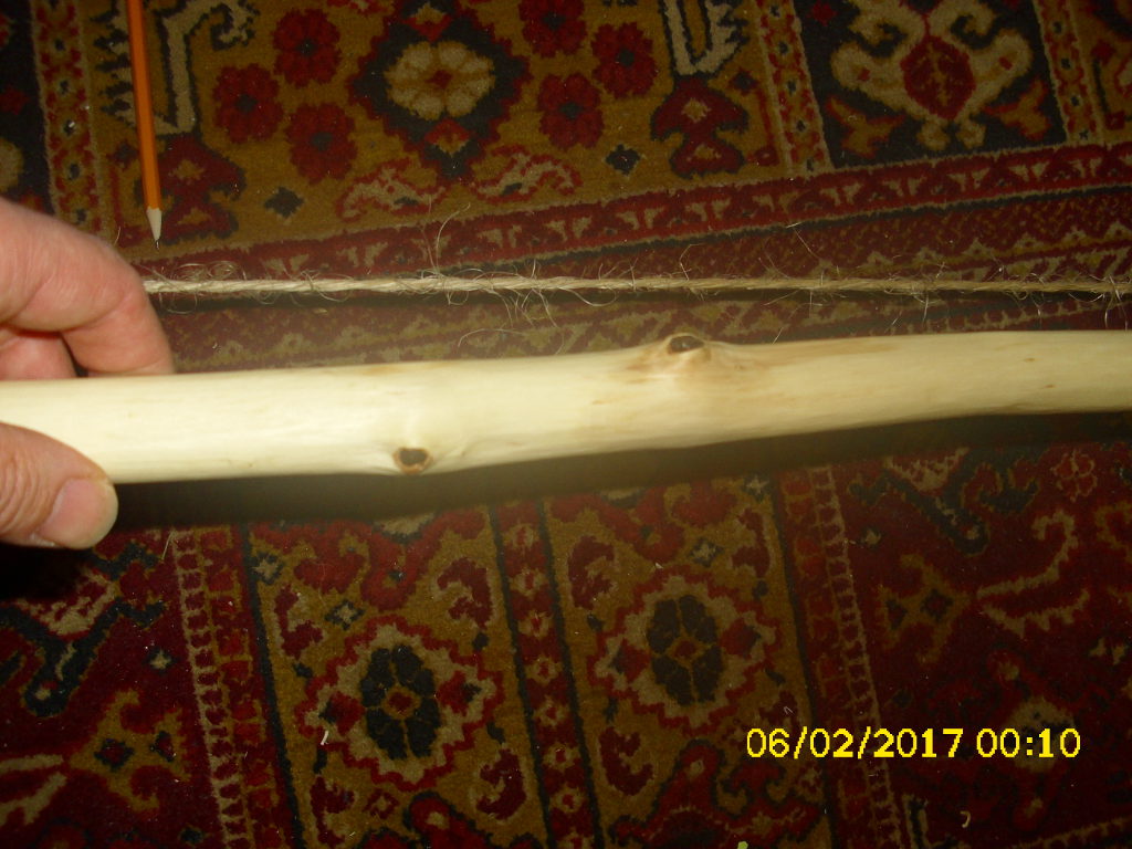 Und für mich die Überraschung, der Hartriegel, null getillert, einfach nach Gusto zugeschnitten, ein bißchen larifari abgezogen und Stiftnocken dran. Bog sich halt schon ganz ok. Also "Make or Break" auf Standhöhe gebracht, Wow.. kein Theater, biegt sich nicht wirklich daneben, Zug knapp unter 4kg/10cm, weiter hab ich ihn nicht gezogen, in der Mitte sieht er noch etwas arg steif aus.