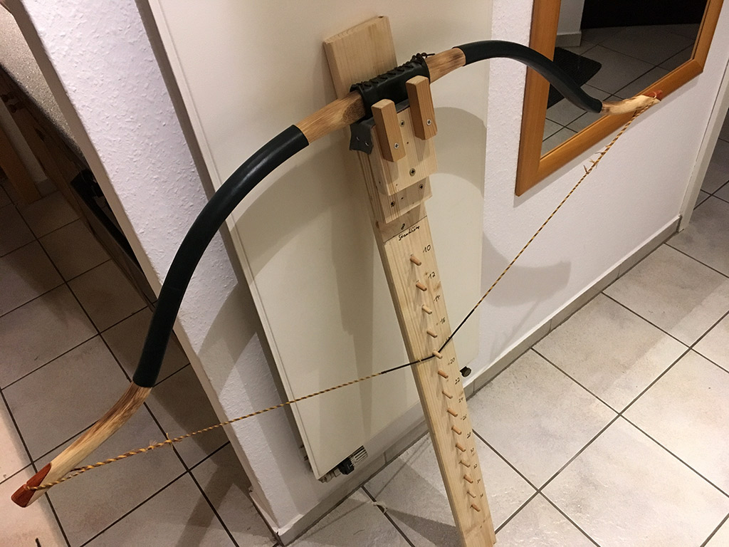 Wenn man erst mal ein bisschen Ahnung hat, kann man aus so einem Stöckchen in einer halben Stunde einen gut funktionierenden Bogen bauen. Ölen, hübscher Griff und so dauert natürlich länger.