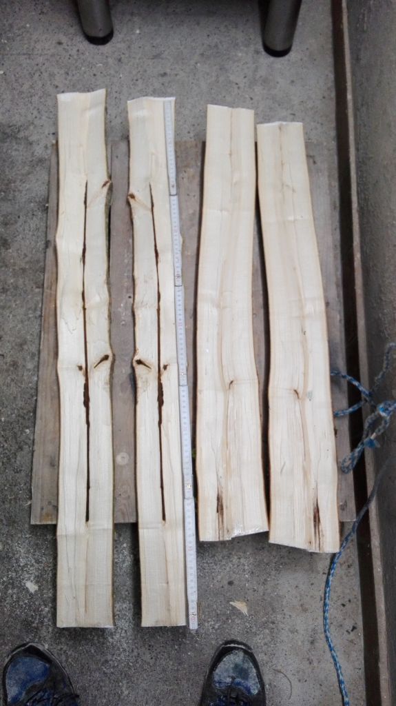 Ich bin an eine Ahorn gekommen , der einer Baustelle weichen musste. Habe ihn gespalten und er hat zum Glück keinen Drehwuchs. 2 Wurfarme habe ich bereits heraus geschnitten, mit liegenden Ringen und etwas Übermaß 50mm breit und 20mm dick. Ich hoffe ich bekomme noch 2 weiter heraus.