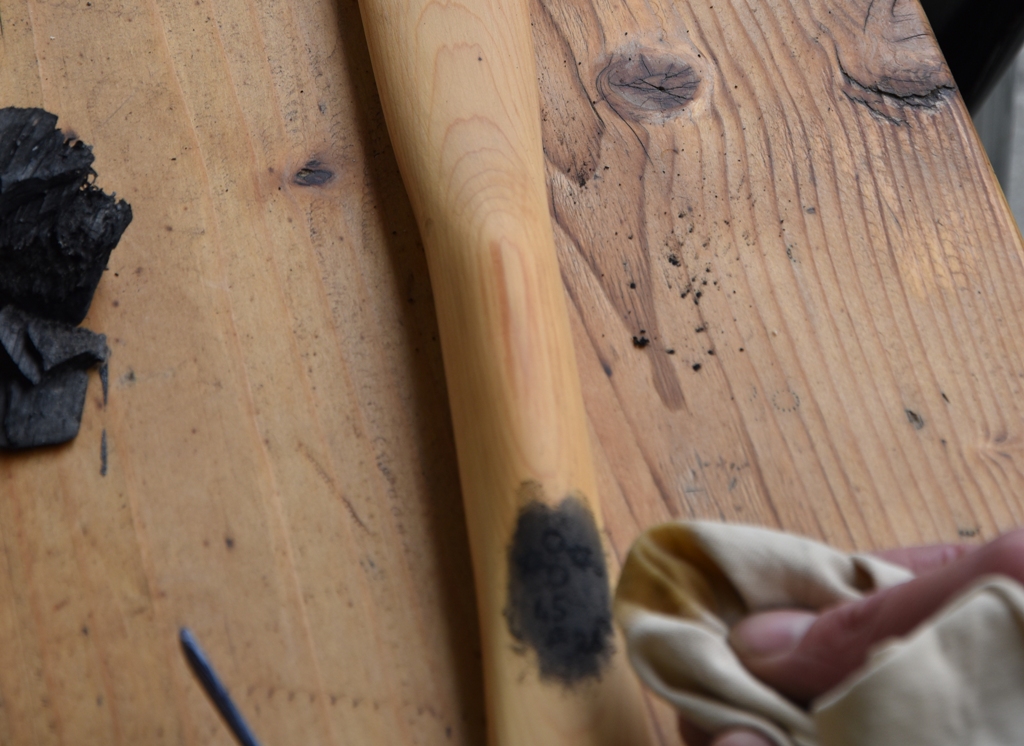 Die zu beschriftende Fläche fein und glatt schleifen. In bestehenden Kratzern bleibt der Kohlenstaub sonst auch hängen und das möchte ich vermeiden.