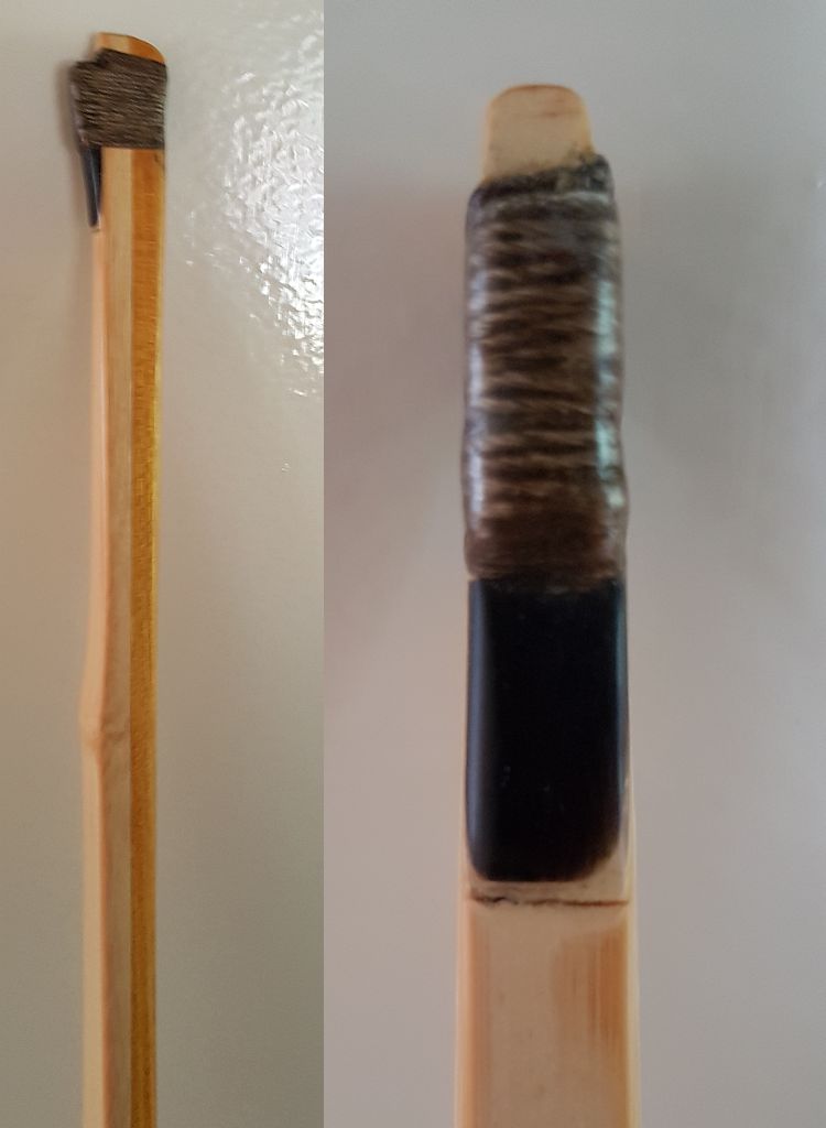 Den Gedanke die Bogenenden noch etwas zu schwächen hatte ich auch. Aber der Osage ist Richtung Ende schon etwas dünn im Verhältnis zum Bambus und schmal genug ist er auch schon. Deshalb habe ich mich mit diesem einigermaßen harmonischen Bild zufrieden gegeben.