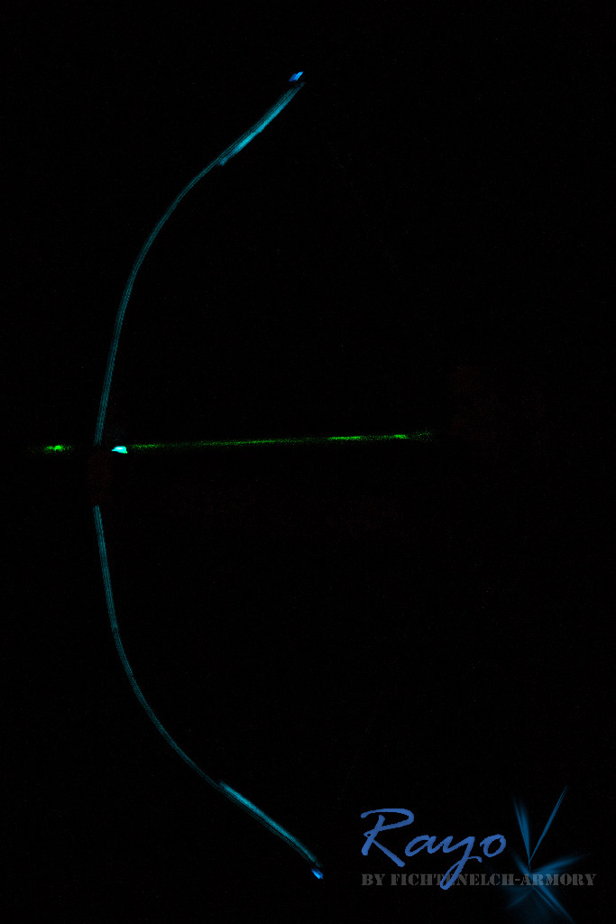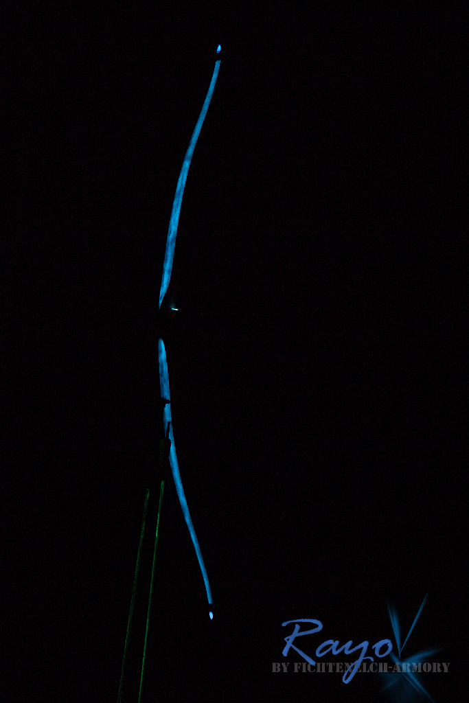 Ich habe in den Kleber phoshorisierende Pigmente mit eingemischt und so strahlt das tagsüber sichtbare Padouk-furnier nachts im fetten Blau, die Tips fangen an zu leuchten, die Pfeilauflage strahlt und am Bogenbauch gibts auch noch ein Paar "Highlights".