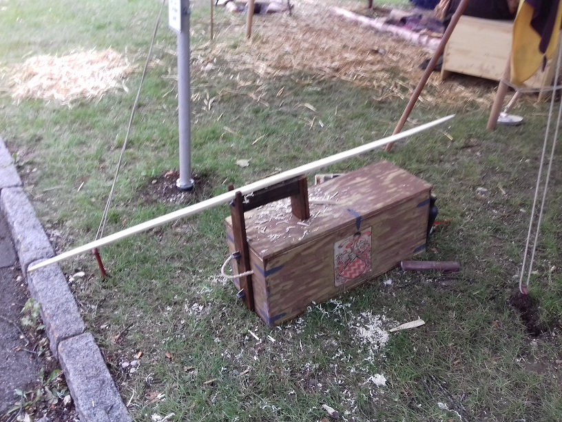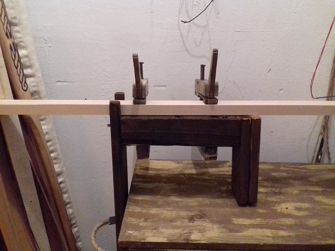 Aktuell fixiere ich den Stave mit 2 Leimzwingen, original werden die mit Eisenkeilen fixiert, da jedoch ist der vordere Teil nicht offen sondern geschlossen mit einer keinen Durchführung im Stirnholz.