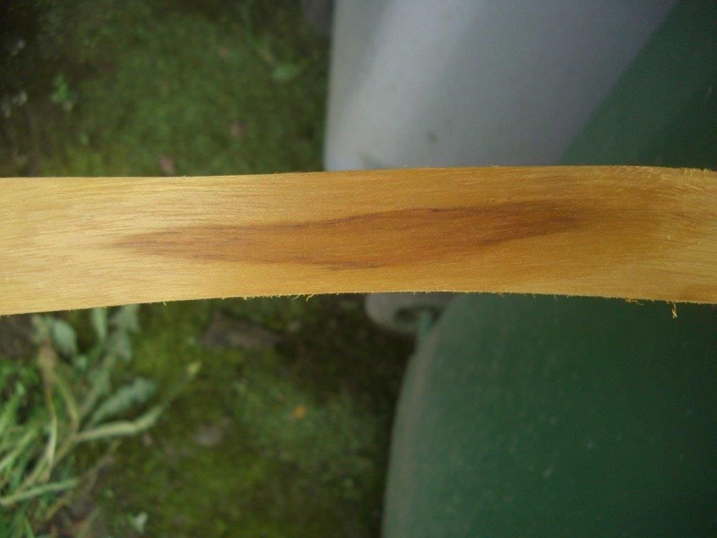 so eine rötliche Maserung hab ich bei Osage auch schon oft gehabt, solange das Holz fest ist - nicht bröselig - dann ist es kein Problem. Für mich sieht es so aus, als wenn es der gleiche Jahresring ist, ich würde es so lassen.