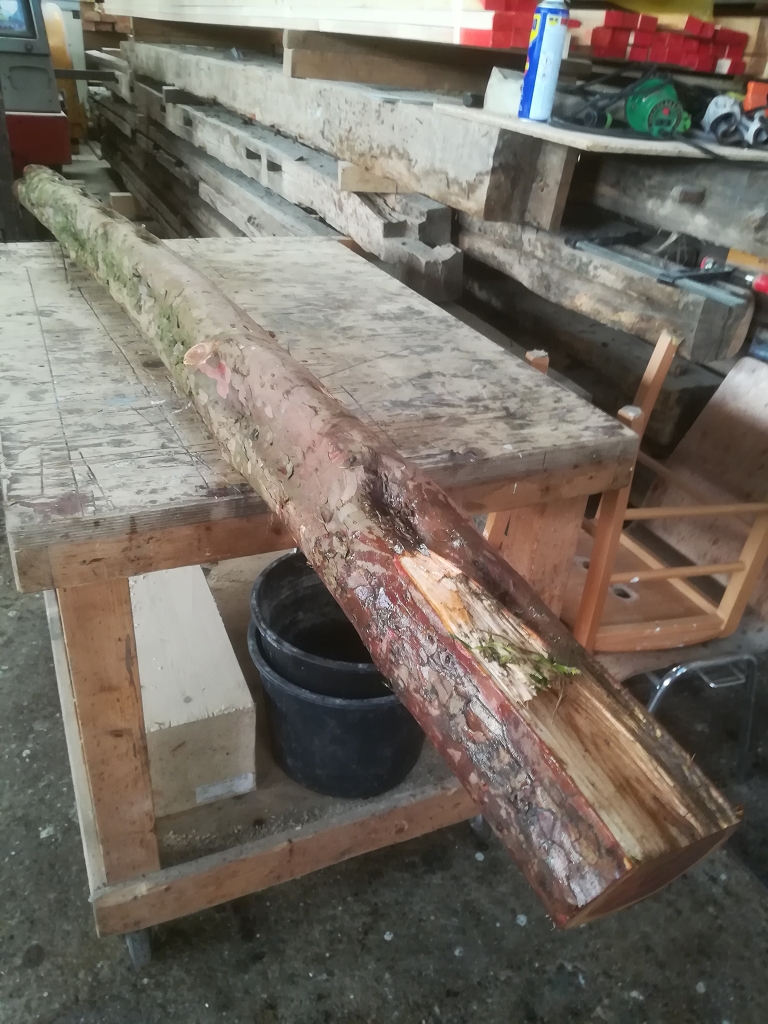 Ich habe heute einen Eibenstamm bekommen und mochte diesen Spalten und anschließend zum Trocknen Lagern. Nun zum Stamm, er ist ca. 2,20m lang wobei die nutzlänge kürzer sein wird, je nachdem was für einen Bogen ich daraus bauen will. Stammdurchmesser ist im Durchschnitt 13cm (12cm und 14cm) er hat für eine Eibe wenige kleinere Äste und hat einen leichten Bogen.. Die Jahresringe sind würde ich mal behaupten relativ eng.