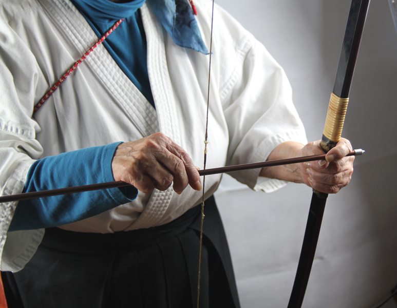 Beim Ebira wie auch beim Shiko Köcher wurde der Peil oberhalb der Spitze gegriffen, nach oben hochgezogen und dann nach unten herrausgezogen und dann zum Bogen geführt. Der Peil wird auf der rechten Bogenseite angelegt und eingenockt.