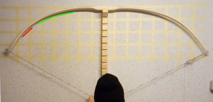 Aber zurück zu diesem Bogen: ich habe ich drei vorsichtigen Schritten noch etwas Holz an der steifen Stelle abgetragen. Ich glaube, so geht es. Seht bitte selbst. Ich wollte auch nicht zu viel wegnehmen, daher mehrere Schritte. Der aktuell geht wohl, wenn dann nur noch einen Hauch. Als ich davor stand, sah es aber nach Krümmung an der Stelle aus.
