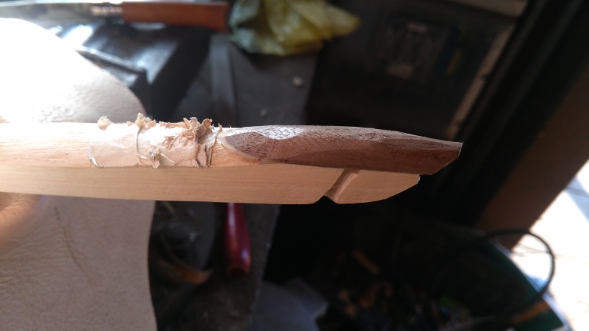 Erstmal den Griff des Hollers etwas verfeinert und gesäubert. Ich denke ich werde in den Markkanal noch ein Stück dunkleres Holz einkleben.