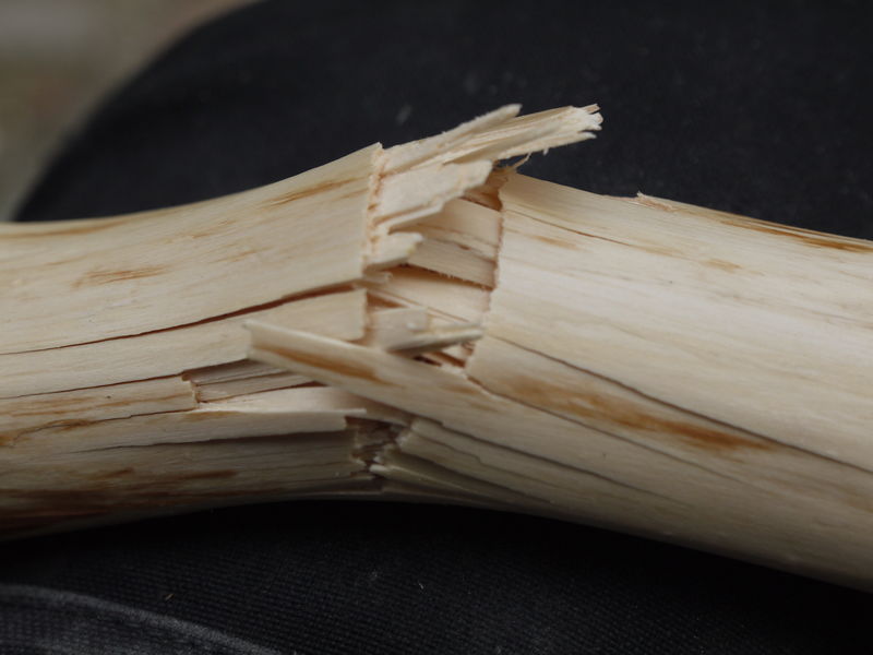 Knack von der Seite Knack von der andern Seite: Knack von oben Jetzt ist die Frage, wie mach ich mit dem andern weiter. Kabelbacking waer eine Option, wobei ich da nicht mehr wirklich 100% Lust drauf hab. Nach Rohhaut waer mir schon eher, aber da hab ich nix da. Muesste mal zum Gerber im Nachbarort oder zum Hundefutterladen schauen. Andere Ideen?