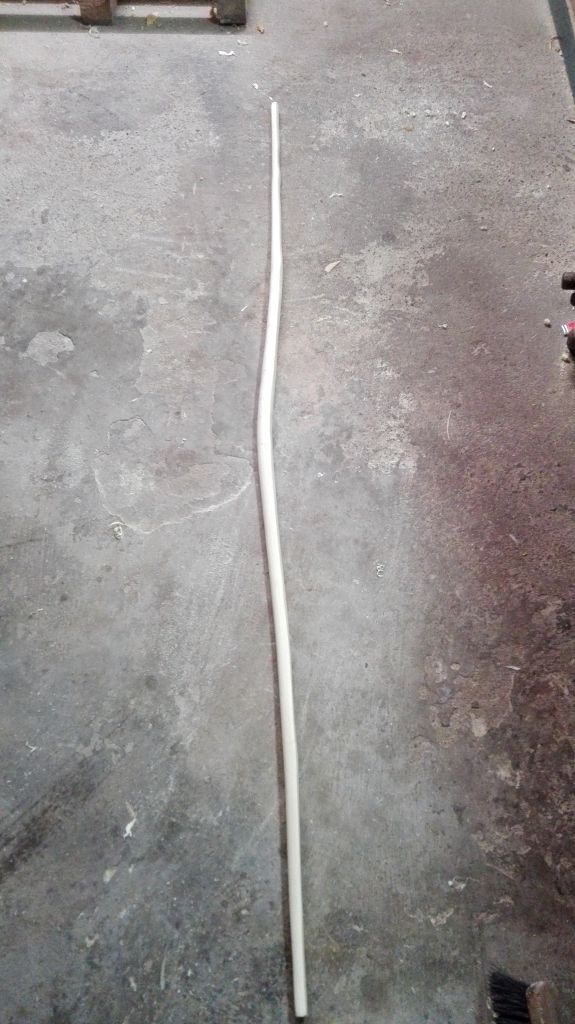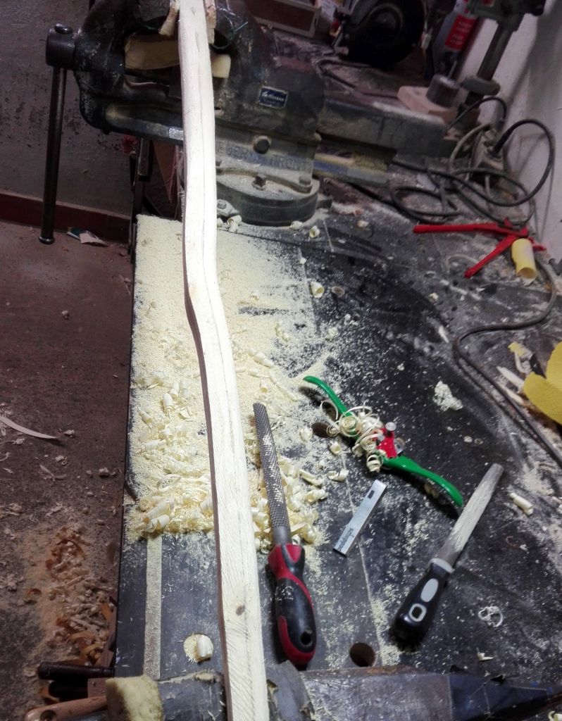 Das Pfaffenhütchen hatte nur noch 2g verloren und war nun fällig seine Form zu erhalten. Also den Stave auf Bogenmaß gebracht und in der Dicke reduziert. Die Sehnenlage musste korrigiert werden . Die Enden wurden leicht geflippt, da der obere Wurfarm ein natürlich geflipptes Ende hatte. Die deflexe Welle vom oberen Wurfarm habe ich heraus gebogen, die wird sicher beim tillern wieder zum Vorschein kommen. Heute Abend bekommt es seinen runden Bauch. Von den geflippten Enden habe ich noch kein Bild gemacht, dass werde ich heute Abend nachreichen. Das Gewicht beträgt zur Zeit 540g und der Stave wird noch einiges Verlieren. Es ist wirklich ein leichtes Holz, dass sich gut verarbeiten lässt(wenn es nicht frisch ist) und in dem Stave stecken locker 50-60 # drin.