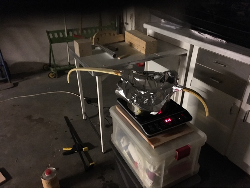 Heute sollten die Enden des fast fertig getillerten Bogens aus Robinie 1 über Dampf geflippt werden. Das waren die letzten beiden Biegungen von insgesamt 9.