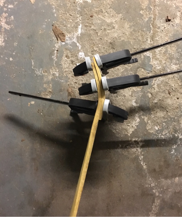 Zuerst habe ich den griffnahen Wurfarmhälften des geraden Vorbogens (Vorbogen2) nacheinander ein wenig Reflex verpasst. Das ging super. Dann habe ich doch noch ein Pflaster für das angebrochene Tip von Robinie 2 aus einem Reststück vom gleichen Stämmchen geschnitzt und nach 30min. im Dampf gebogen.