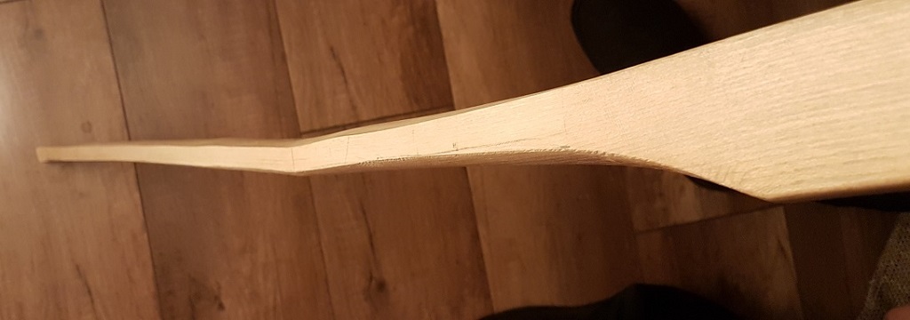 Tja, wie geht’s nun weiter? Ich überlege mit der Schwanenhalsklinge diese beiden Jahresringe heraus zu nehmen, dass allerdings würde den Wurfarm ja noch dünner machen...