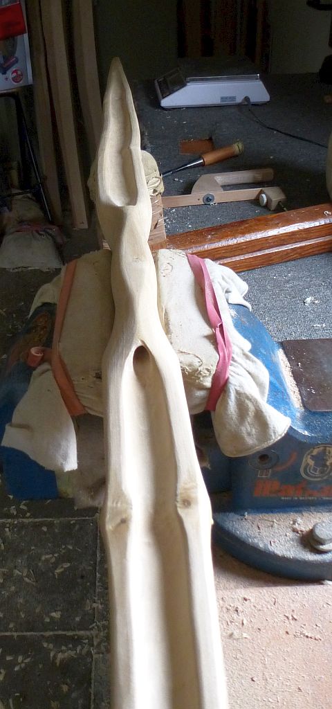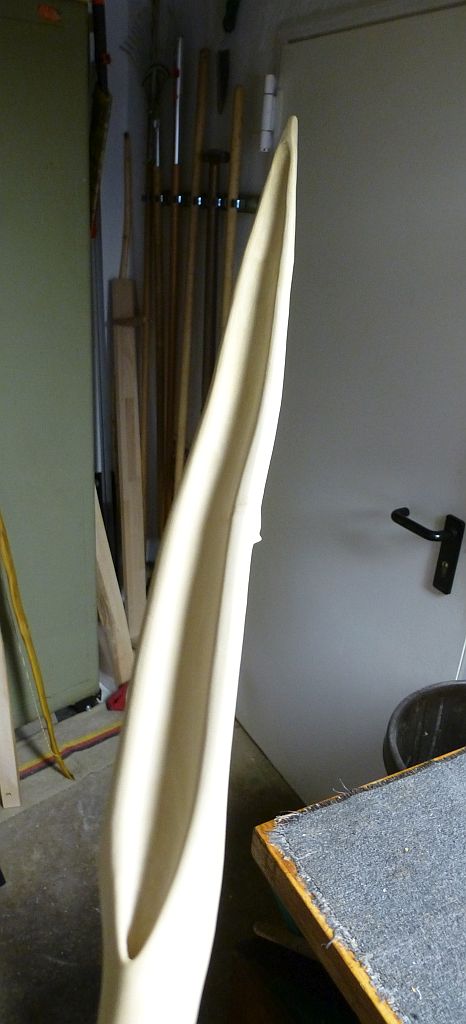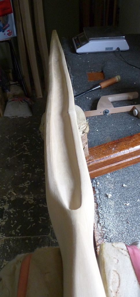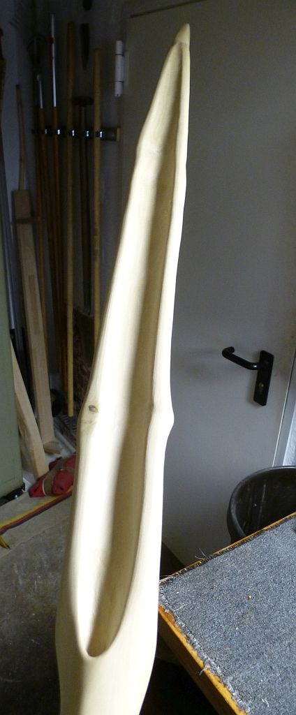 Gestern habe ich beide Tips und den Griff auf ihre vorerst endgültige Form gebracht. Nach Bearbeitung mit der Schwanenhalsziehklinge sind die WA jetzt 18mm dick, aber immer noch zu stark.