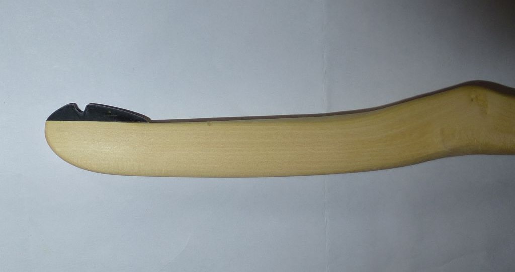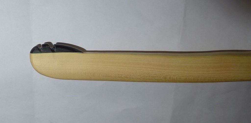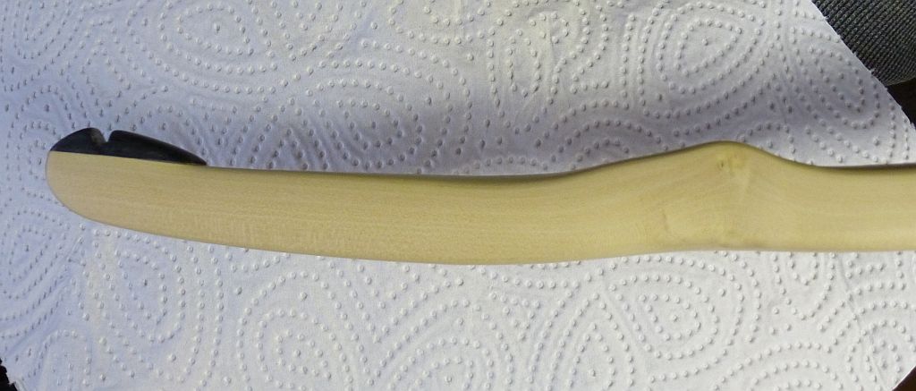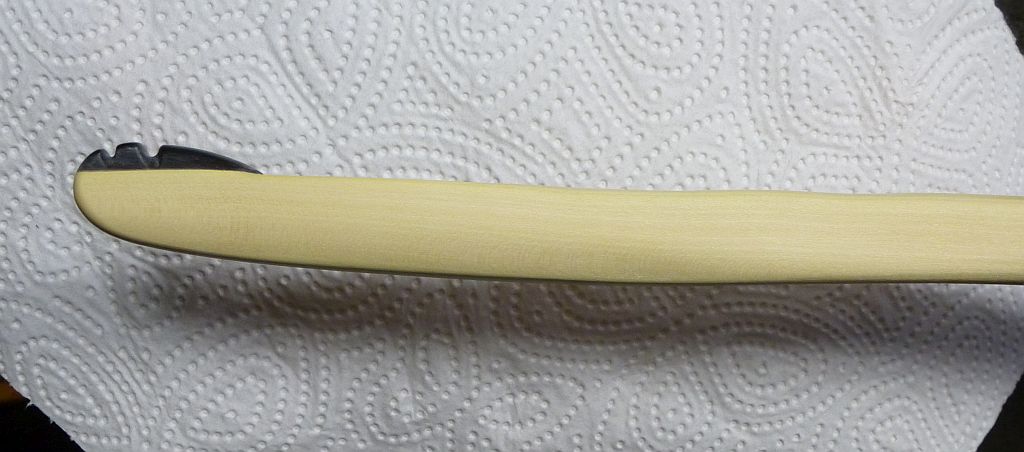 Der Bogen verliert immer noch mehr als 10g pro Tag hier im Haus und das Holz langsam immer härter. Damit ich hintenraus nicht in Zeitnot komme, hab ich schon mal Horn auf die Tips geklebt und grob in Form gebracht. Die Tips sind recht dünn und sollten trocken genug sein. Mittlerweile verdrehen sich die Tips um ein my, ist aber noch im Rahmen.