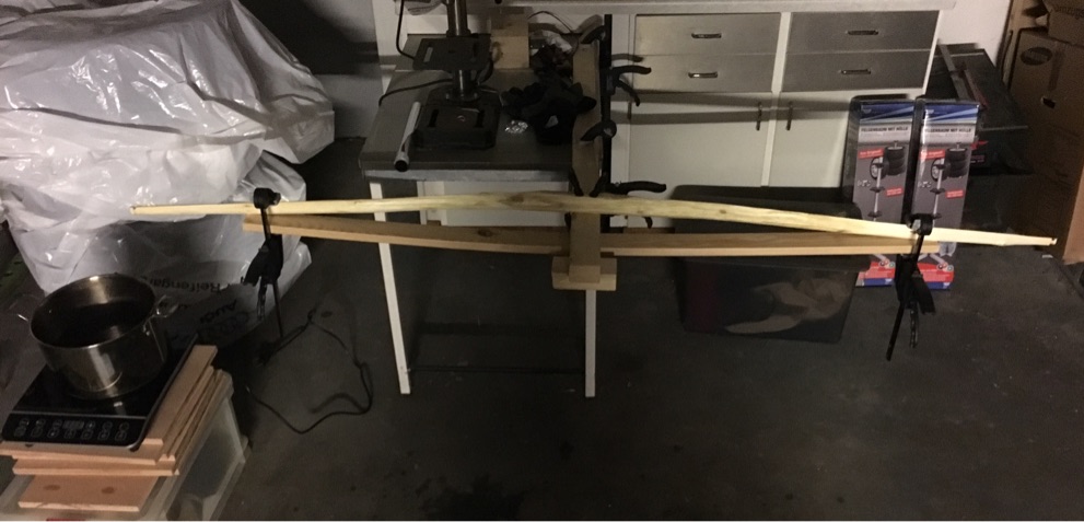 Bei Robinie 3 lief die Sehne leider komplett neben dem Griff. Darum hab mich heute doch wieder an den Kochtopf gewagt und versucht, den Bogen griffnah zu begradigen und auch gleich ein dezentes Setback einzudämpfen.