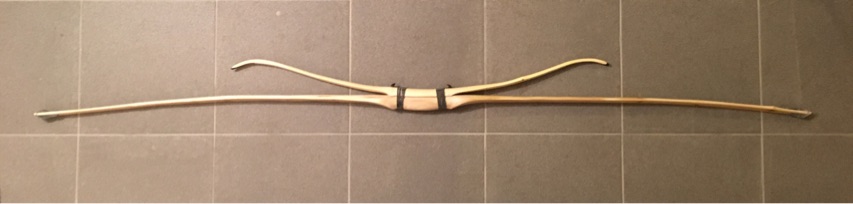 Die beiden Bögen sind jetzt mit einer dünnen Lage Leder zwischen den Griffteilen verbunden und die Kabelhaken festgeklebt und gewickelt. Für die Doppelnocken wurden zwei Hornplatten in die WA-Enden eingepasst und euliert.