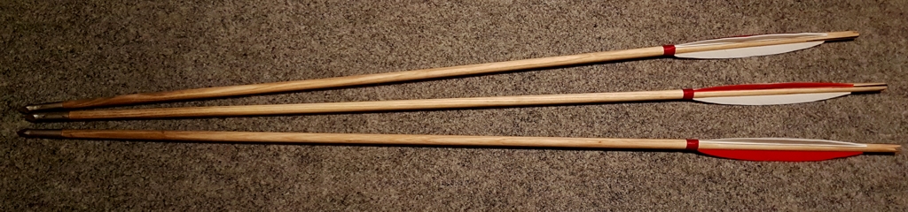 Und bevor jetzt Empörung aufkommt ob des Wortes Flightpfeile: Ich nenne die Dinger Medieval-Style-Flightpfeile (und wenn der Bogen dann z.B. 95# hat, sind das knappe 6,8 grains / Pound): lange Federn (6"), aber flach und Saubuckel (10 mm Höhe) , gebarrelt, keilförmige Horninlays und in der Größe reduzierte Spitzen mit ca. 130 grains Gewicht.