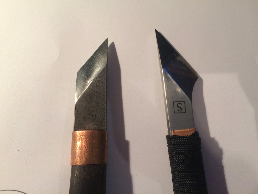 Hier zum Vergleich, das linke Messer ist für Linkshänder, rechts für Rechtshänder. Durch den einseitigen Anschliff sind rechtwinklige Anschnitte einfacher.