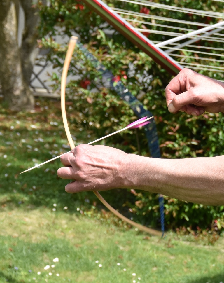 Da hat mich "z Güegi " gestochen, schnell eine Sehne gemacht und aus Schaschlickspiesschen ein paar Pfeile. Das Teil geht ganz schön ab...