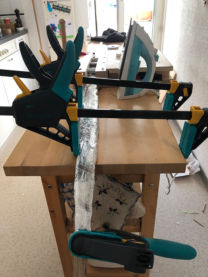 Nach zwei misslungen Versuchen ihn mit Dampf zurecht zu biegen und einem Bruch, den ich zum Glück nochmals wegschleifen konnte, habe ich eine neue Art entdeck wie man Holz in Form bringt. Mittels einem nassen Tuch, etwas Alufolie und einem Bügeleisen lässt sich das Holz wunderbar und ohne Eile in Form bringen. Der Vorgang lässt sich super kontrollieren, weil die Hitze nicht sofort entweicht, wie beim normalen dämpfen. Im Gegenteil, der Bogen bleibt heiss und kann wo nötig nochmals erhitzt werden indem man nochmals darüber fährt. Unten seht ihr die Bilder, der Rest ist selbsterklärend.