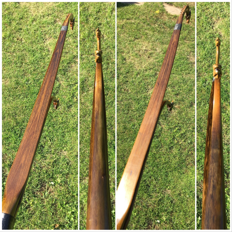 - Haupt- und Vorbogen aus Robinie, Drachenkopf-Siyahs und -Nocken aus Eibe, Hornzapfen zur Aufnahme der Sehne in allen vier Mäulern