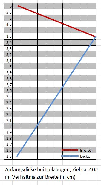 Je breiter der Bogen wird, desto weniger Spielraum hast Du also in der Dicke, soll heißen: desto präziser muss man an der Dicke arbeiten. Und da das Tillern nun mal beim Holzbogen i.d.R. über die Dicke stattfindet, wird es immer schwieriger, je gringer der Spielraum wird. Daher sollte man die Breite "so viel wie nötig, so wenig wie möglich" wählen.