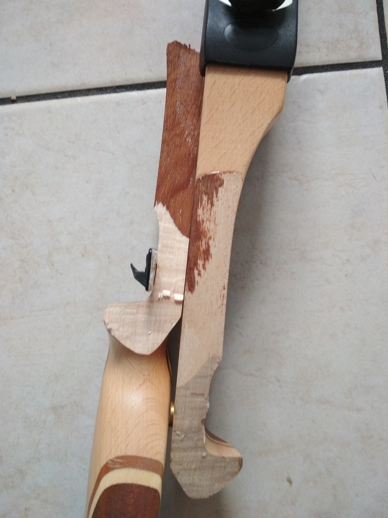 Wie bereits erwähnt wurde der Bogen nur noch mit 18 Pfund geschossen maximal 2h die Woche und nur bei gutem Wetter, da wir keine Möglichkeit haben in einer Halle zu schießen. Gestern hat es ihn dann ganz zerlegt. Fehler beim verkleben meinerseits? Die stellen die ich geklebt habe sind die einzigen an denen Splitter hängen, das deutet für mich eigentlich eher darauf hin, dass die stelle gut gehalten hat. Aber wenn die anderen Stellen versagt haben kann das eckchen oben natürlich auch nichts mehr reissen. Ich hätte also doch vermutlich mutiger sein sollen und versuchen die ganze Verbindung zu lösen und komplett neu zu verkleben.