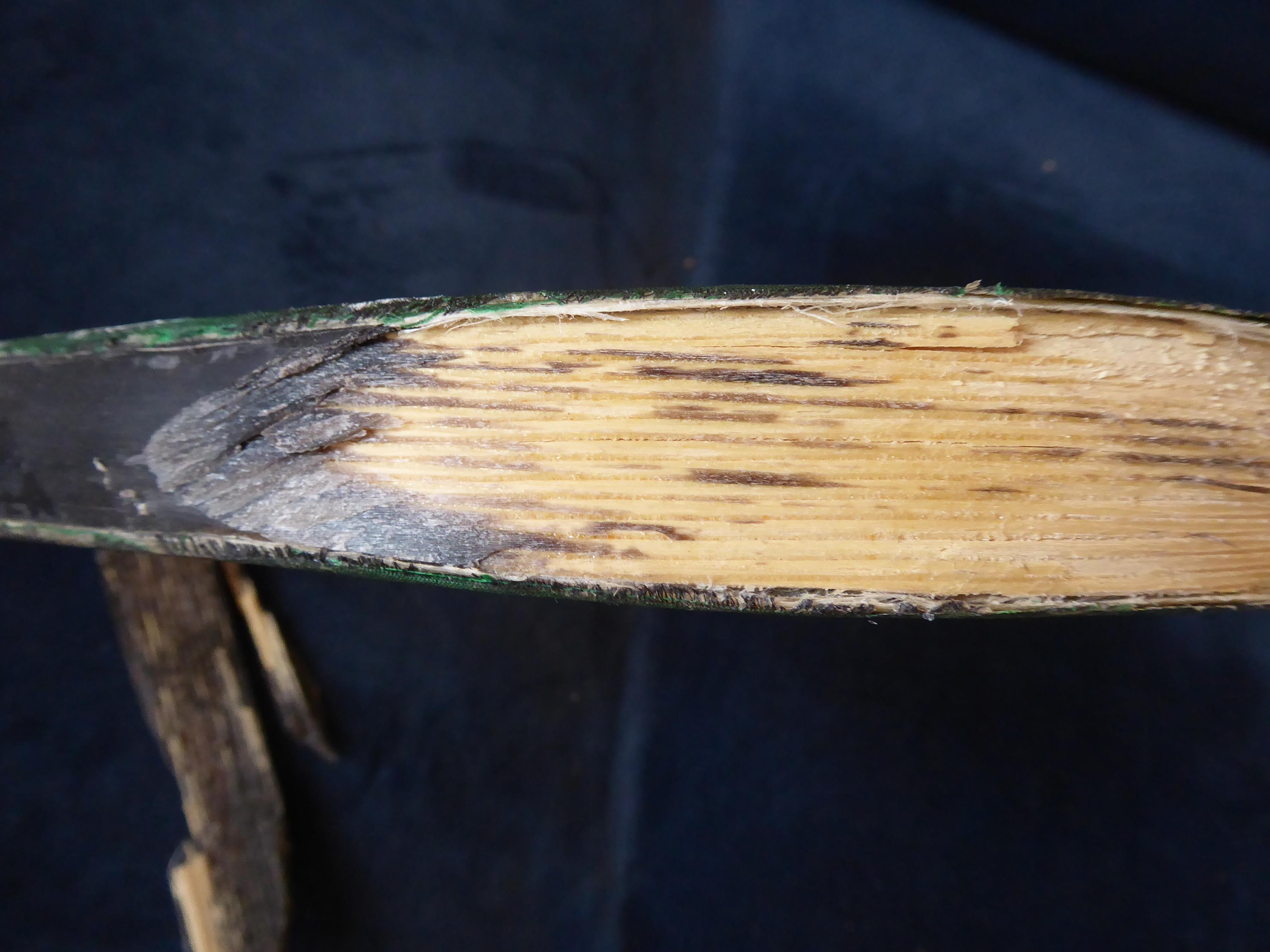 --Die Bruchfläche liegt weitestgehend zwischen Horn und Holz, schon mehr im Holz, Hornreste finden sich kaum. Die Haftung innerhalb der obersten Leim-Holzschicht war nicht ok, in dieser Schicht erfolgte der Bruch. Die Riefelung im Holz sieht jedoch gut aus, könnte noch breiter und tiefer sein.