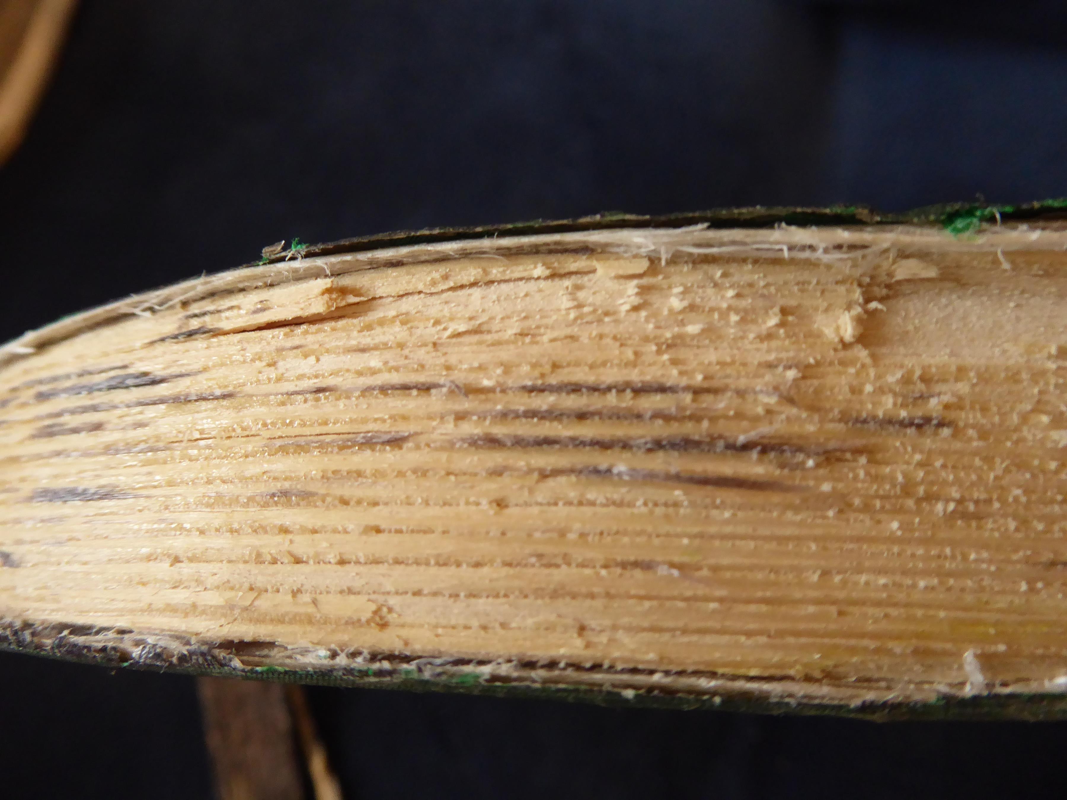 --Die Bruchfläche liegt weitestgehend zwischen Horn und Holz, schon mehr im Holz, Hornreste finden sich kaum. Die Haftung innerhalb der obersten Leim-Holzschicht war nicht ok, in dieser Schicht erfolgte der Bruch. Die Riefelung im Holz sieht jedoch gut aus, könnte noch breiter und tiefer sein.
