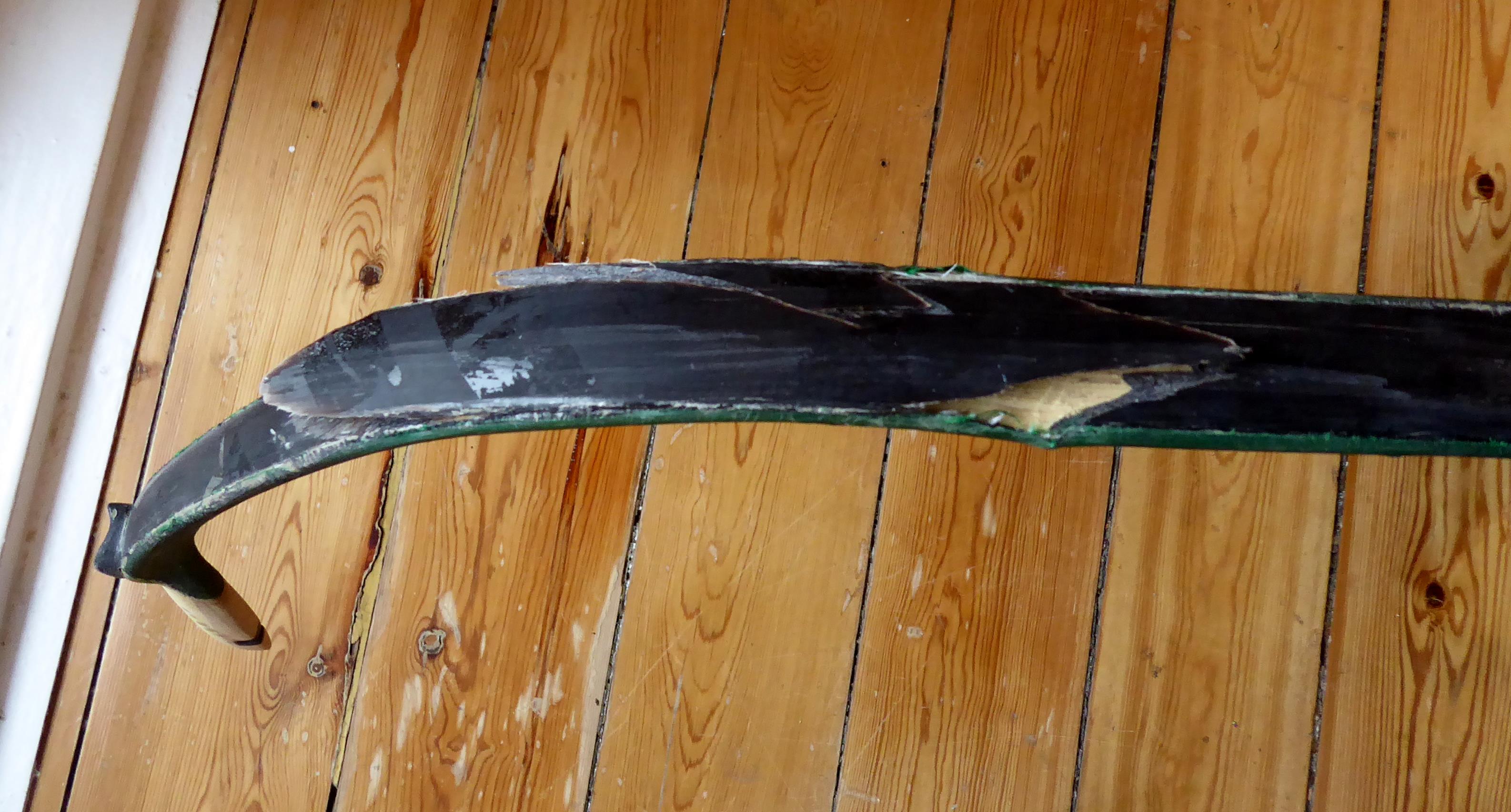 Woran lag es, dass er gebrochen ist? Ich bin mir da nicht sicher. Ein Faktor war sicher die Verdrehung und meine Korrekturversuche. Ein anderer war womöglich das Horn. Ich hab aus den zwei Hörnern noch zwei weitere Streifen herausgeschliffen und probeweise relativ stark belastet, wobei sich das Horn stellenweise als spröde geoutet hat...