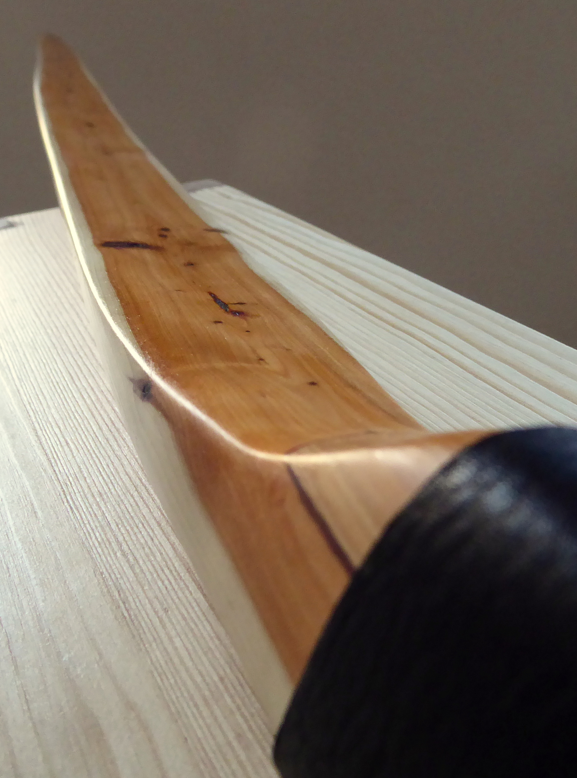 Dieser Bogen entstand aus einem schmalen Stave, deshalb umschließt der Splint das Kernholz bei dem flachen WA-Profil. Im Griff habe ich ein Stück Eibe aufgeklebt. Der größere Totast bedingt den steiferen Abschnitt im Tiller des oberen Wurfarms. Der Bogen wurde ausgiebig eingeschossen, wirft sehr gut und wird dem neuen Besitzer hoffentlich viel Freude machen.