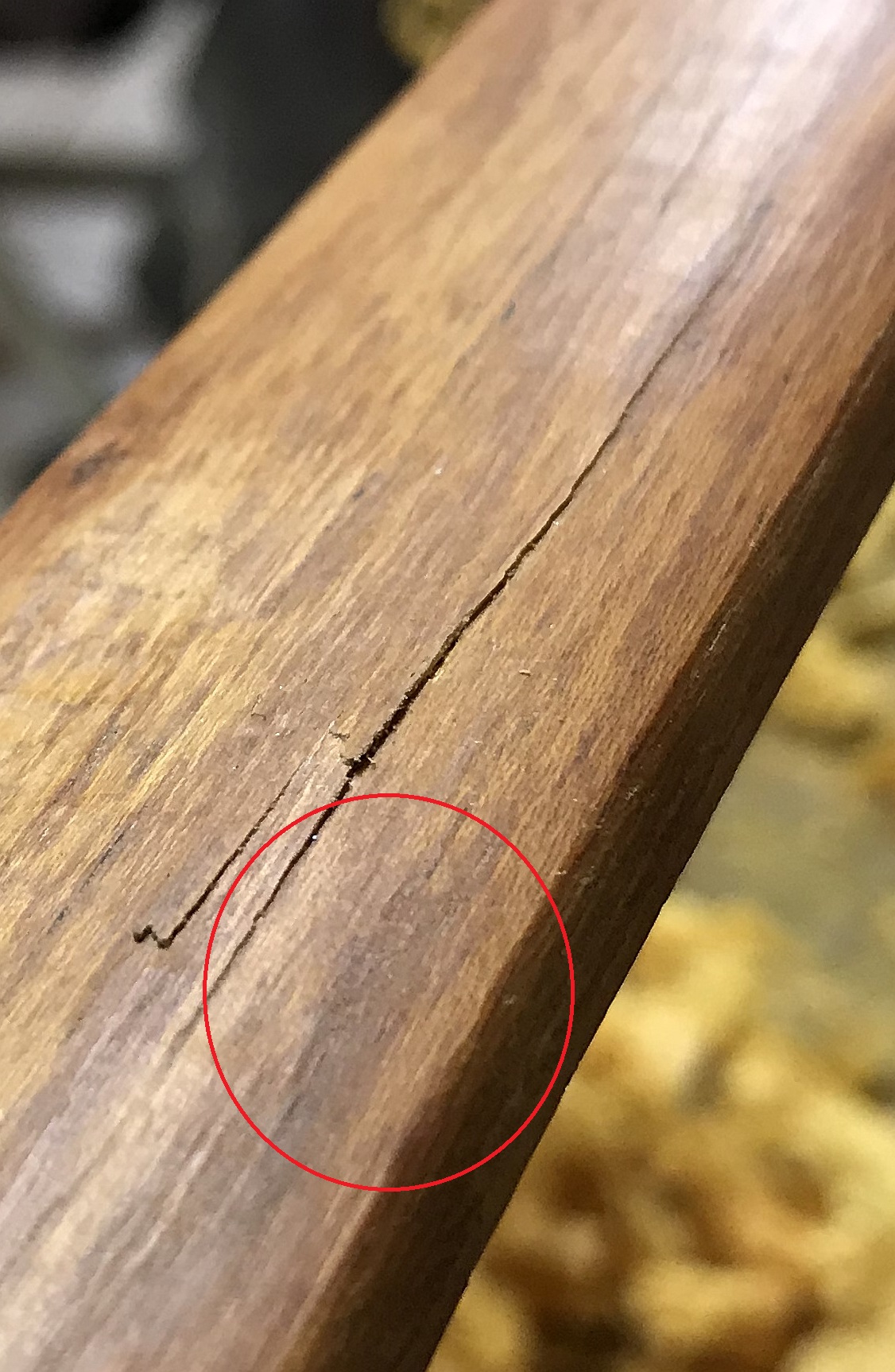 Tach, mein Tip: zieh den Ring auf den nächsten ab und zwar sauber auf die Ringgrenze! Der Bruch sieht nach einem Bruch im Frühholz aus = nicht sauber, der Ringgrenze folgend, abgezogener Jahrring bei einem lange und trocken gelagerten Holz.