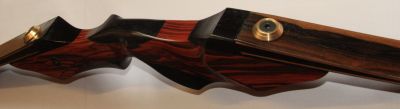 Der Griff ist aus SaRaiFo Palisander und schwarz, die Wurfarme mit Zirikote Furnier unter Klarglas und die Bauchseite mit schwarzem Glas. Das ganze für 31" Auszug gebaut.
